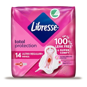 Libresse Total Protection Ultra Regular maandverband biedt tot 100% comfortabele bescherming tegen doorlekken* zodat je alles uit je dag kunt halen.